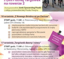 Wyjątkowe wycieczki rowerowe po Targówku. Znany przewodnik- Jarek Spacerolog Praski z ekipy przewodnickiej Praska Ferajna. Rodzinna atmosfera i niespodzianki na trasie. To już drugi cykl projektu Poznaj Targówek na rowerze, którego organizatorem jest stowarzyszenie Targówek w spódnicy. 10 września godz. 11:00 – 14:00 START przy stacji Warszawa-Praga, ul. Pożarowa (adres GPS […]