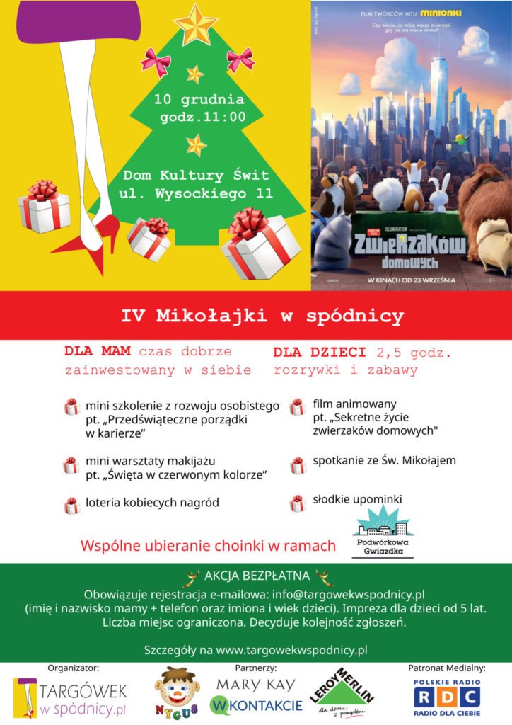 Ile razy rezygnowałyście z udziału w ciekawych wydarzeniach, szkoleniach itp. tylko dlatego, że nie miałyście z kim zostawić swoich pociech? A jak często uczestniczyłyście w wydarzeniach z ofertą skierowaną wyłącznie do dzieci, swoje potrzeby odkładając na dalszy plan? Tym razem nie ma takiej potrzeby. Zapraszamy na IV Mikołajki w spódnicy, które odbędą się 10 grudnia, start godz. 11:00 w Domu Kultury „Świt”. Projekt skierowany nie tylko do dzieci, ale równocześnie do kobiet.