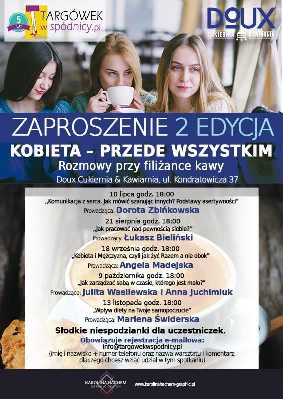 W klimatycznej Kawiarni & Cukierni DOUX, przy aromacie świeżo parzonej kawy i słodkich wypieków prosto z pieca za każdym razem powstaje niezwykła, cudownie przyjazna atmosfera spotkania, otwartości i wzajemnej wymiany doświadczeń i inspiracji. Niepowtarzalna interakcja pomiędzy uczestniczkami i trenerami. Te spotkania pokazują jak ważne jest, w dzisiejszym szalonym tempie życia, znalezienie choć odrobiny czasu dla siebie i jak bardzo może się zmienić nasze postrzeganie różnych problemów, gdy przegadamy je w kobiecym gronie, przy wsparciu świetnych trenerów.