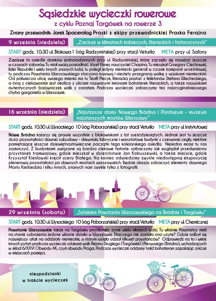 Już w najbliższą niedzielę 9 września o godz. 10:30 przy ul. Blokowej 1 startuje trzecia edycja projektu „Poznaj Targówek na rowerze”. Z okazji inauguracji cyklu na trasie będą czekały na uczestników liczne niespodzianki. Rozpoczynamy tematem – „Zacisze w klimatach kobiecych, literackich i historycznych”. Naszym przewodnikiem będzie Jarek Spacerolog Praski z Praskiej Ferajny.